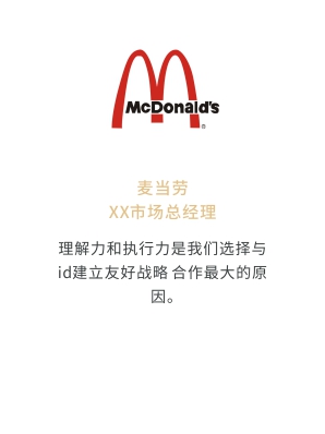 i-d先后經(jīng)歷與Audi、Mercedes-Benz、infiniti、PORSCHE、可口可樂、麥當(dāng)勞、肯德基、Budweiser、華為、小米、中國移動、ELLE、L'OREAL、萬達(dá)、仁恒置地、恒大、碧桂園、蘭桂坊...的業(yè)務(wù)合作,成功地將國際化的營銷策劃理念及執(zhí)行方式融入本土,為更多的中國企業(yè)開啟全新的品牌推廣思路和執(zhí)行方案。